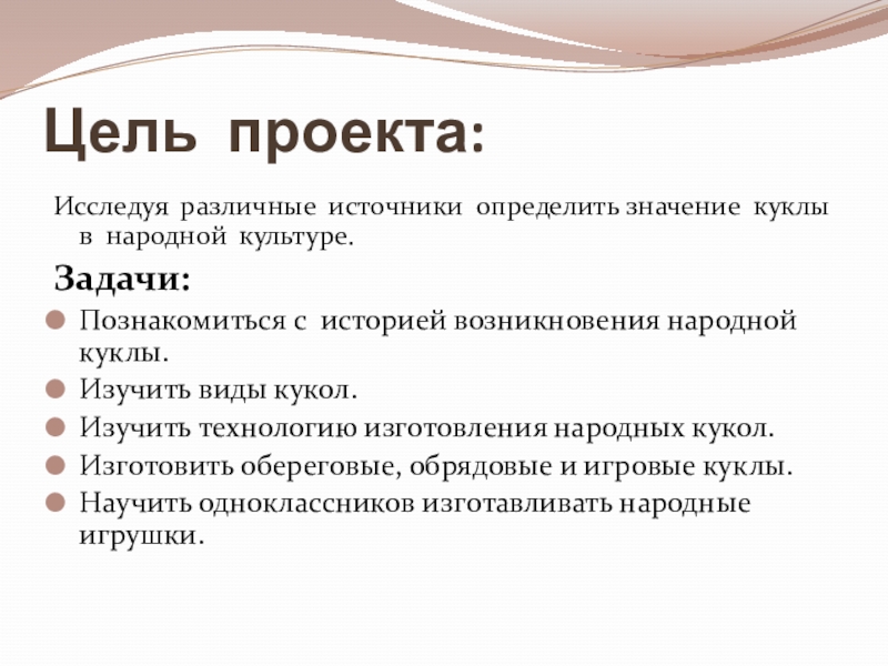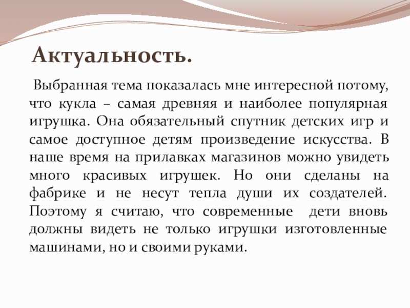 самая древняя и наиболее популярная игрушка. Она обязательный спутник детских игр и самое доступное детям произведение искусства. В наше время на прилавках магазинов можно увидеть много красивых игрушек. Но они сделаны на фабрике и не несут тепла души их создателей. Поэтому я считаю, что современные дети вновь должны видеть не только игрушки изготовленные машинами, но и своими руками.