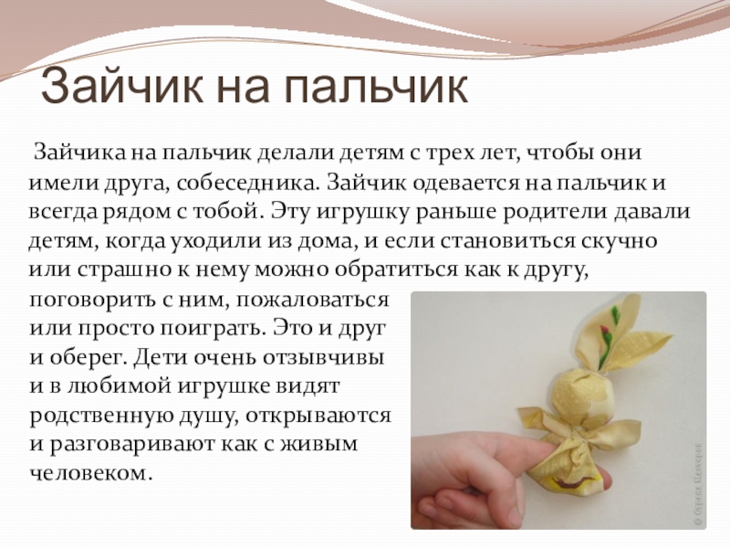 лет, чтобы они имели друга, собеседника. Зайчик одевается на пальчик и всегда рядом с тобой. Эту игрушку раньше родители давали детям, когда уходили из дома, и если становиться скучно или страшно к нему можно обратиться как к другу,
