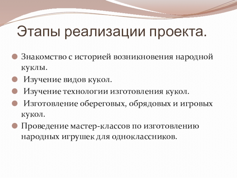 Изучив технологию изготовления кукол ,я провел мастер-класс по их изготовлению для одноклассников. При изготовлении куклы недопустимо использовать колющие и режущие предметы. А ещё очень важно делать куклу с добрыми намерениями и в хорошем настроении.
