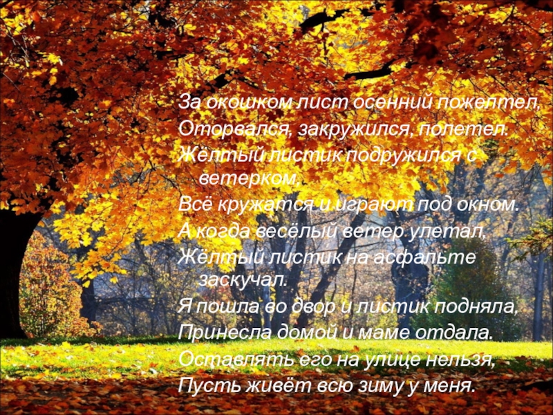 За окошком лист осенний пожелтел,Оторвался, закружился, полетел.Жёлтый листик подружился с ветерком,Всё кружатся и играют под окном.А когда