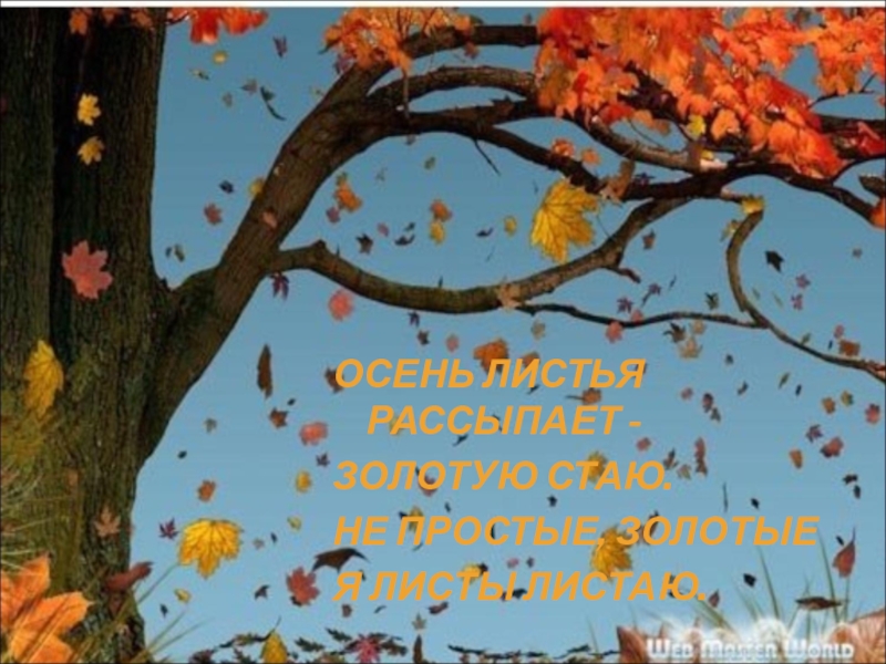 ОСЕНЬ ЛИСТЬЯ РАССЫПАЕТ - ЗОЛОТУЮ СТАЮ.НЕ ПРОСТЫЕ, ЗОЛОТЫЕЯ ЛИСТЫ ЛИСТАЮ.