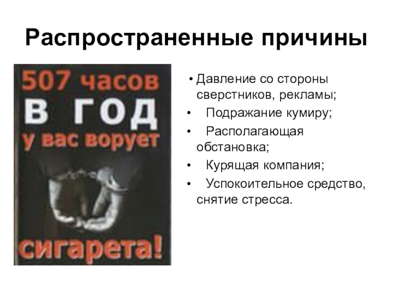 Распространенные причиныДавление со стороны сверстников, рекламы;•    Подражание кумиру;•    Располагающая обстановка;