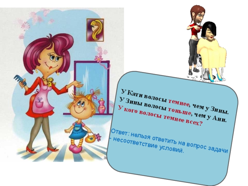 У Кати волосы темнее, чем у Зины. У Зины волосы тоньше, чем у Ани. У кого волосы темнее всех?