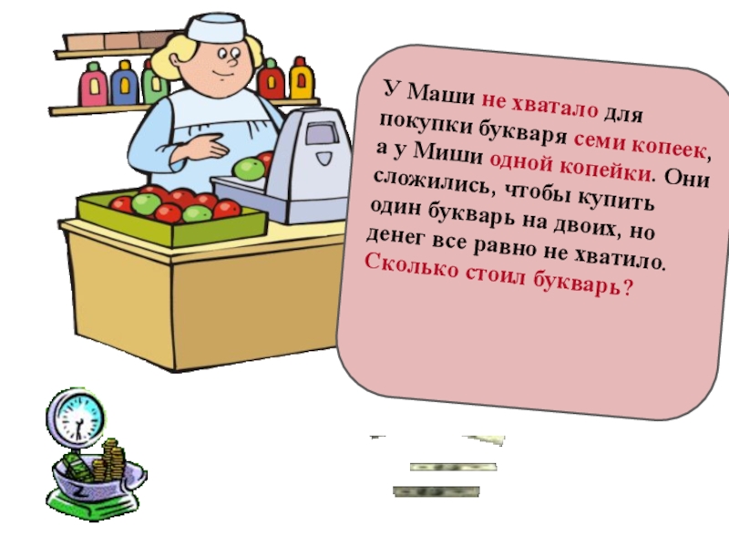 а у Миши одной копейки. Они сложились, чтобы купить один букварь на двоих, но денег все равно не хватило. Сколько стоил букварь?