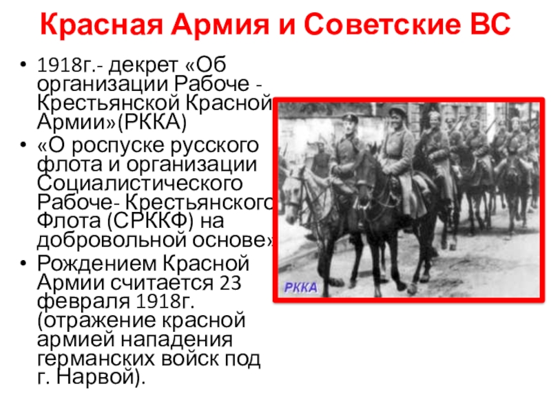 Рождением Красной Армии считается 23 февраля 1918г. (отражение красной армией нападения германских войск под г. Нарвой).