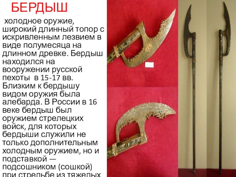 виде полумесяца на длинном древке. Бердыш находился на вооружении русской пехоты в 15-17 вв. Близким к бердышу видом оружия была алебарда. В России в 16 веке бердыш был оружием стрелецких войск, для которых бердыши служили не только дополнительным холодным оружием, но и подставкой — подсошником (сошкой) при стрельбе из тяжелых фитильных ружей.