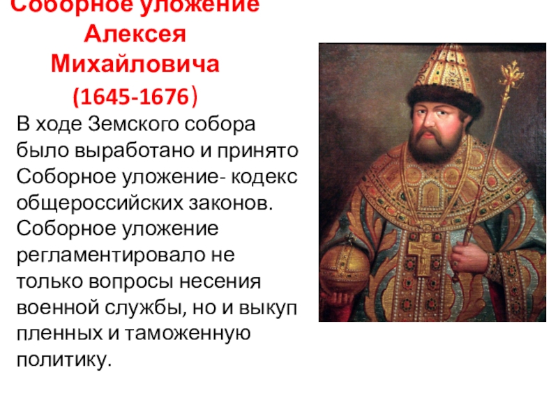 принято Соборное уложение- кодекс общероссийских законов. Соборное уложение регламентировало не только вопросы несения военной службы, но и выкуп пленных и таможенную политику.