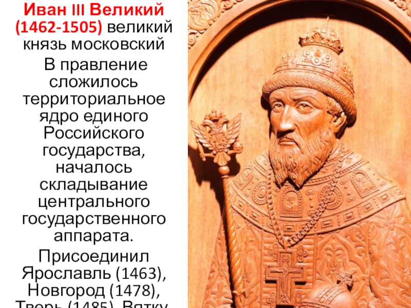 Присоединил Ярославль (1463), Новгород (1478), Тверь (1485), Вятку, Пермь и др.