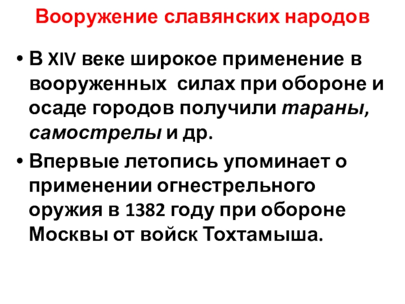 Впервые летопись упоминает о применении огнестрельного оружия в 1382 году при обороне Москвы от войск Тохтамыша.