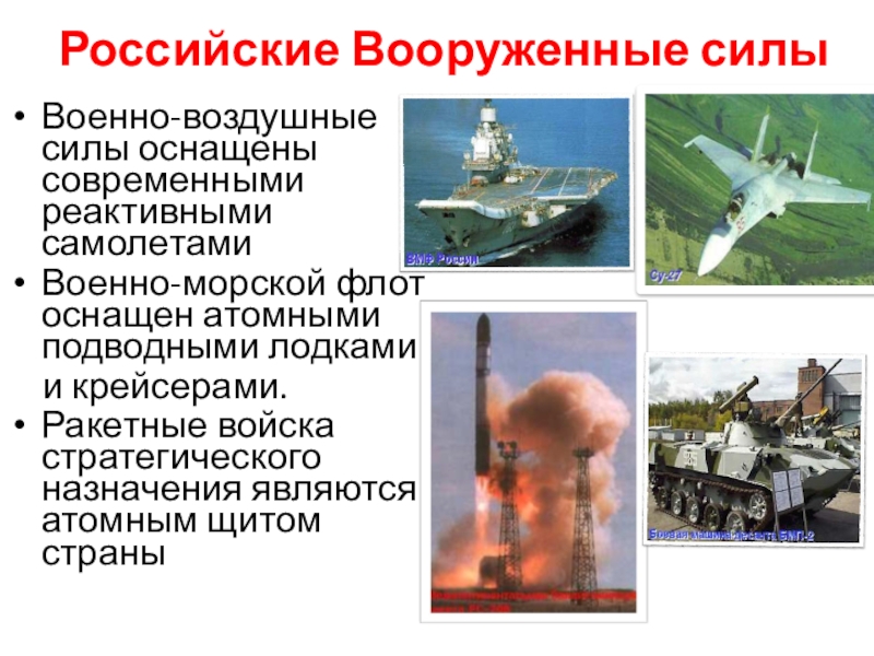 Ракетные войска стратегического назначения являются атомным щитом страныСухопутные войска оснащены современной техникой