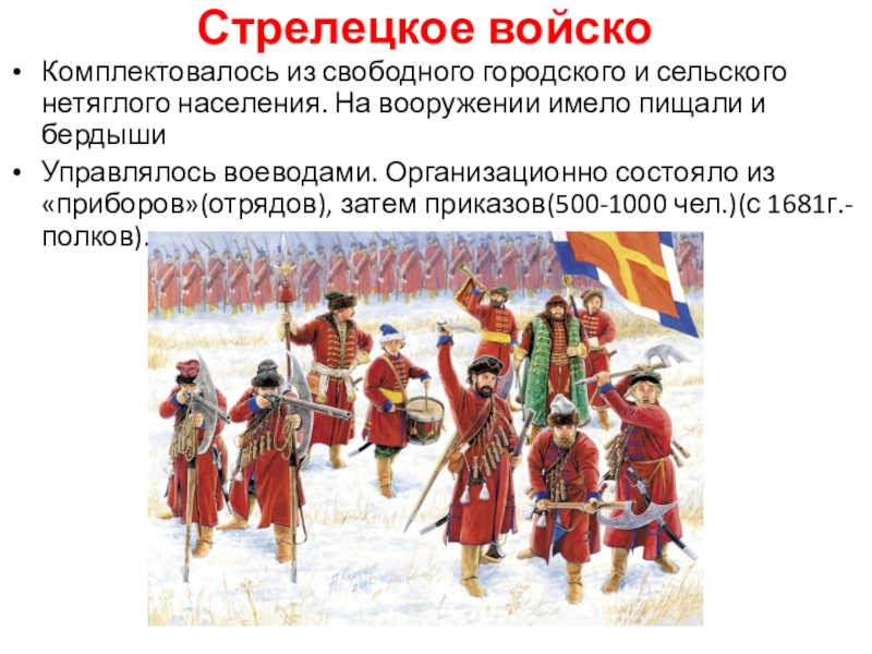 Управлялось воеводами. Организационно состояло из «приборов»(отрядов), затем приказов(500-1000 чел.)(с 1681г.- полков).