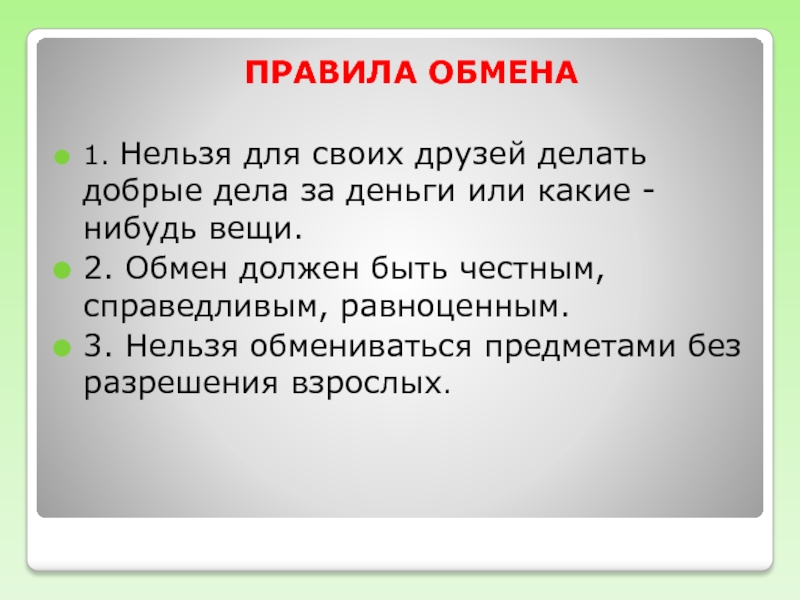 ПРАВИЛА ОБМЕНА1. Нельзя для своих друзей делать добрые дела за деньги или какие - нибудь вещи.2.