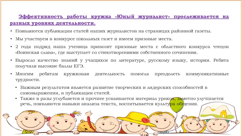Важным результатом является развитие творческих и лидерских способностей в самовыражении, в публикации статей.