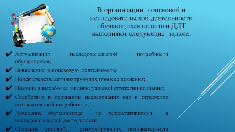 В организации поисковой и исследовательской деятельности обучающихся педагоги ДДТ выполняют следующие задачи: