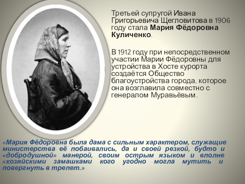 «Мария Фёдоровна была дама с сильным характером, служащие министерства её побаивались, да и своей резкой, будто и «добродушной» манерой, своим острым языком и вполне «хозяйскими замашками кого угодно могла мутить и повергнуть в трепет.»