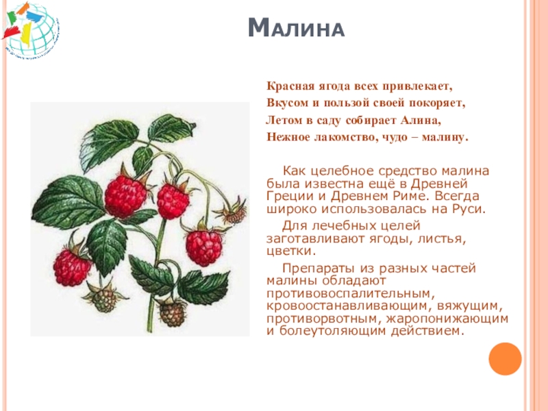 Препараты из разных частей малины обладают противовоспалительным, кровоостанавливающим, вяжущим, противорвотным, жаропонижающим и болеутоляющим действием.