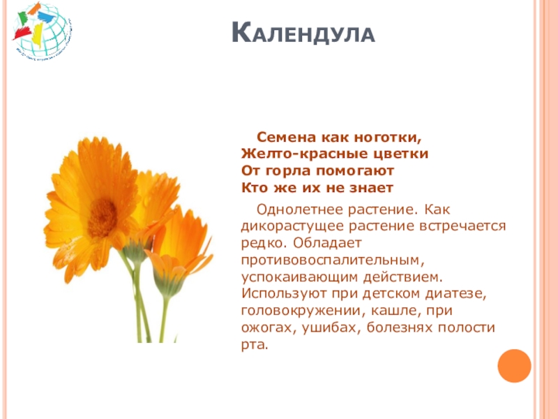 Как дикорастущее растение встречается редко. Обладает противовоспалительным, успокаивающим действием. Используют при детском диатезе, головокружении, кашле, при ожогах, ушибах, болезнях полости рта.