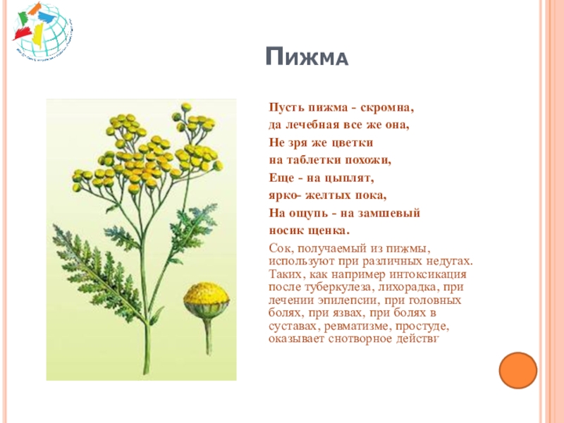 Сок, получаемый из пижмы, используют при различных недугах. Таких, как например интоксикация после туберкулеза, лихорадка, при лечении эпилепсии, при головных болях, при язвах, при болях в суставах, ревматизме, простуде, оказывает снотворное действие.