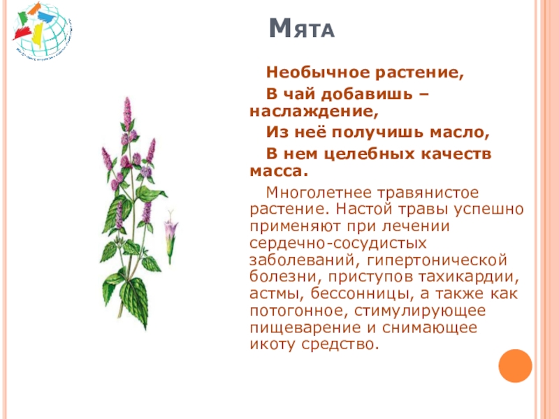 Многолетнее травянистое растение. Настой травы успешно применяют при лечении сердечно-сосудистых заболеваний, гипертонической болезни, приступов тахикардии, астмы, бессонницы, а также как потогонное, стимулирующее пищеварение и снимающее икоту средство.
