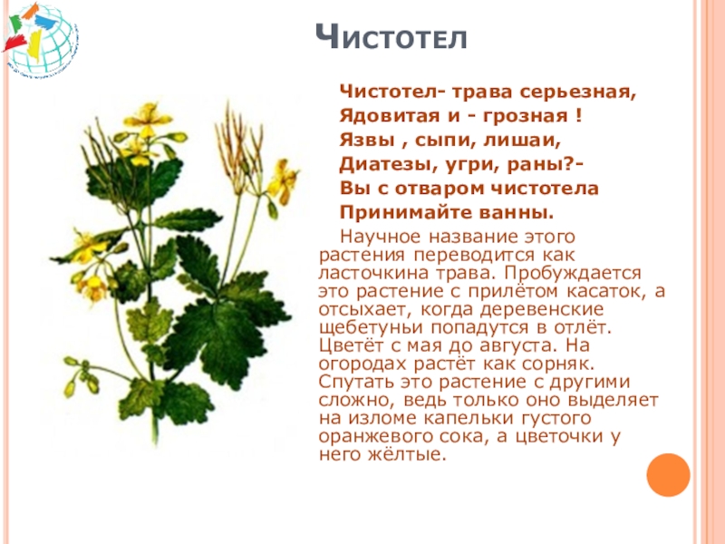 Научное название этого растения переводится как ласточкина трава. Пробуждается это растение с прилётом касаток, а отсыхает, когда деревенские щебетуньи попадутся в отлёт. Цветёт с мая до августа. На огородах растёт как сорняк. Спутать это растение с другими сложно, ведь только оно выделяет на изломе капельки густого оранжевого сока, а цветочки у него жёлтые.