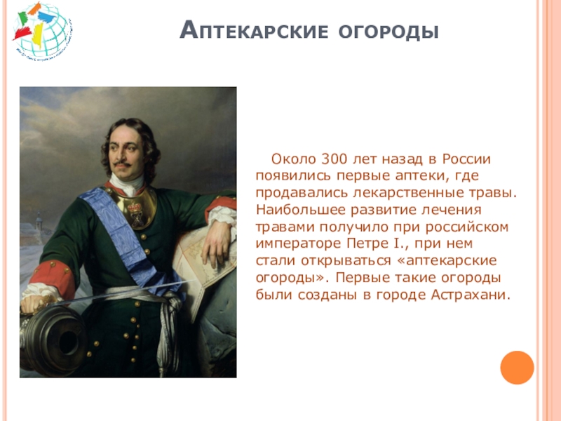 продавались лекарственные травы. Наибольшее развитие лечения травами получило при российском императоре Петре I., при нем стали открываться «аптекарские огороды». Первые такие огороды были созданы в городе Астрахани.