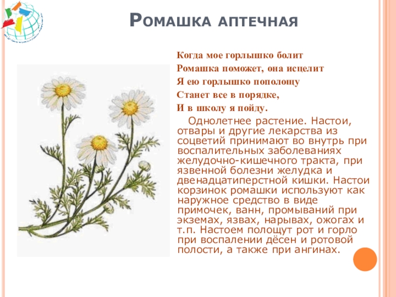 Однолетнее растение. Настои, отвары и другие лекарства из соцветий принимают во внутрь при воспалительных заболеваниях желудочно-кишечного тракта, при язвенной болезни желудка и двенадцатиперстной кишки. Настои корзинок ромашки используют как наружное средство в виде примочек, ванн, промываний при экземах, язвах, нарывах, ожогах и т.п. Настоем полощут рот и горло при воспалении дёсен и ротовой полости, а также при ангинах.