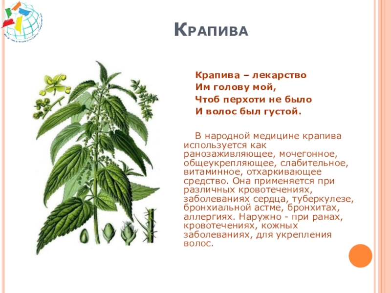 народной медицине крапива используется как ранозаживляющее, мочегонное, общеукрепляющее, слабительное, витаминное, отхаркивающее средство. Она применяется при различных кровотечениях, заболеваниях сердца, туберкулезе, бронхиальной астме, бронхитах, аллергиях. Наружно - при ранах, кровотечениях, кожных заболеваниях, для укрепления волос.
