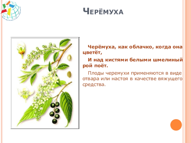 Слайд 19Черёмуха, как облачко, когда она цветёт,