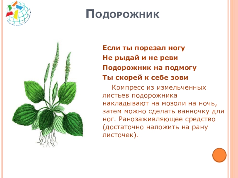 Компресс из измельченных листьев подорожника накладывают на мозоли на ночь, затем можно сделать ванночку для ног. Ранозаживляющее средство (достаточно наложить на рану листочек).