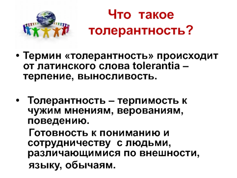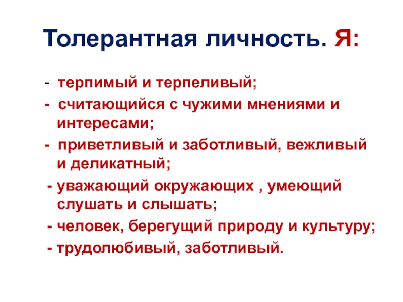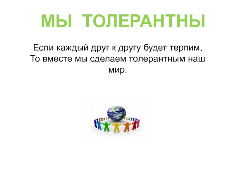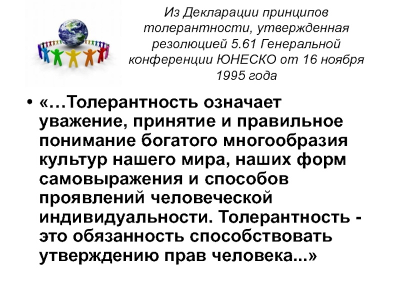 «…Толерантность означает уважение, принятие и правильное понимание богатого многообразия культур нашего мира, наших форм самовыражения и способов проявлений человеческой индивидуальности. Толерантность - это обязанность способствовать утверждению прав человека...»