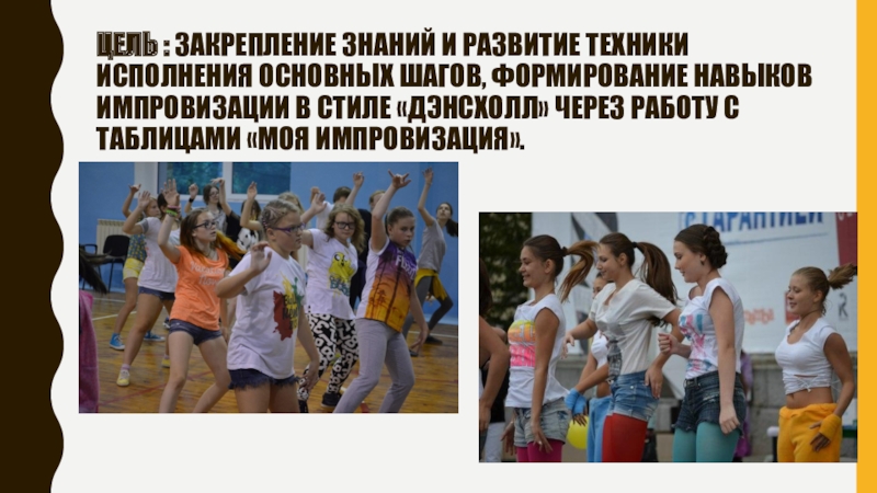 Цель : Закрепление знаний и развитие техники исполнения основных шагов, формирование навыков импровизации в стиле «Дэнсхолл» через