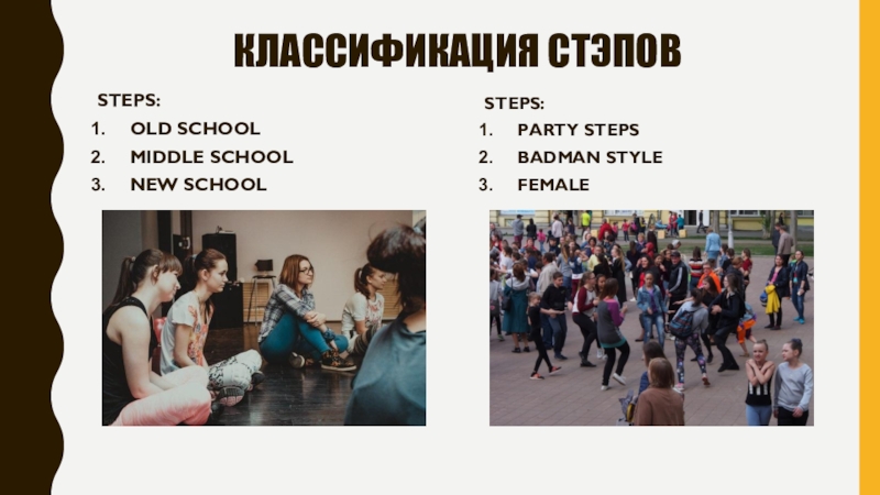 Классификация СтэповSteps:Old schoolMiddle schoolNew schoolsteps:Party stepsBadman stylefemale