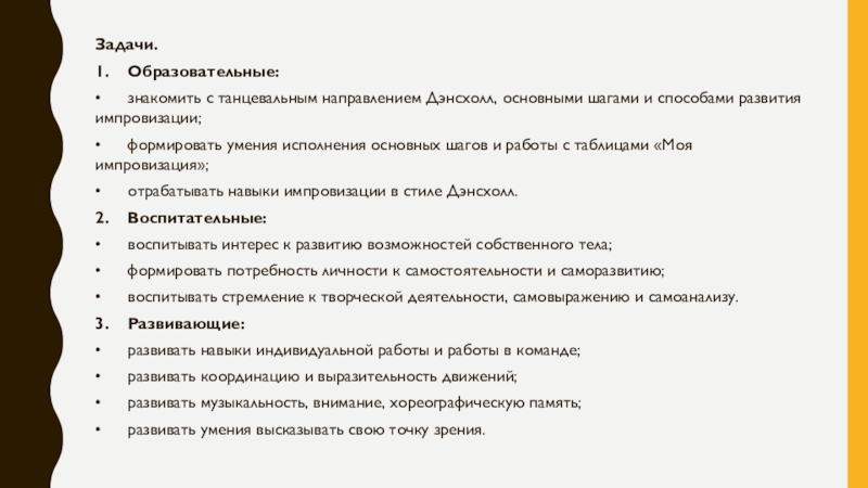 Задачи.1.	Образовательные:•	знакомить с танцевальным направлением Дэнсхолл, основными шагами и способами развития импровизации;•	формировать умения исполнения основных шагов и работы