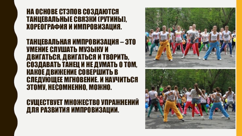 Слайд 8На основе стэпов создаются танцевальные связки (рутины), хореография и импровизация. Танцевальная импровизация