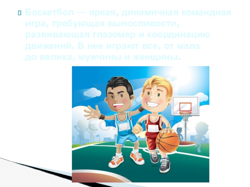 Слайд 22Баскетбол — яркая, динамичная командная игра, требующая выносливости, развивающая глазомер и координацию движений.