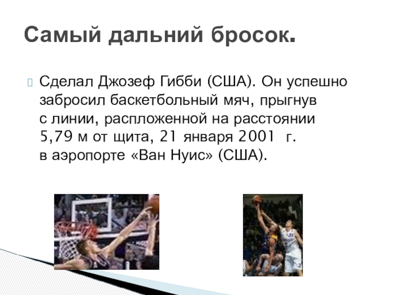 Сделал Джозеф Гибби (США). Он успешно забросил баскетбольный мяч, прыгнув