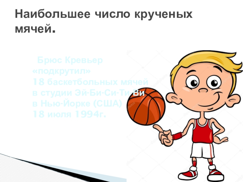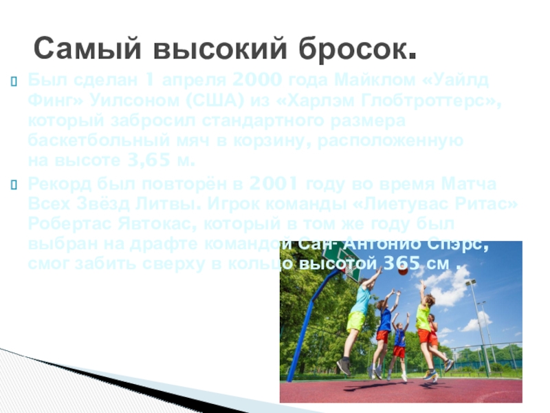 из «Харлэм Глобтроттерс», который забросил стандартного размера баскетбольный мяч в корзину, расположенную на высоте 3,65 м.