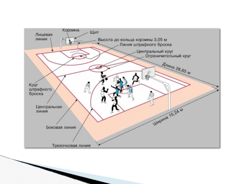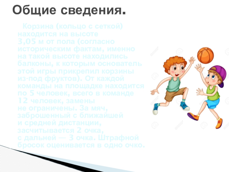 фактам, именно на такой высоте находились балконы, к которым основатель этой игры прикрепил корзины из-под фруктов). От каждой команды на площадке находится по 5 человек, всего в команде 12 человек, замены не ограничены. За мяч, заброшенный с ближайшей и средней дистанции, засчитывается 2 очка, с дальней — 3 очка. Штрафной бросок оценивается в одно очко.