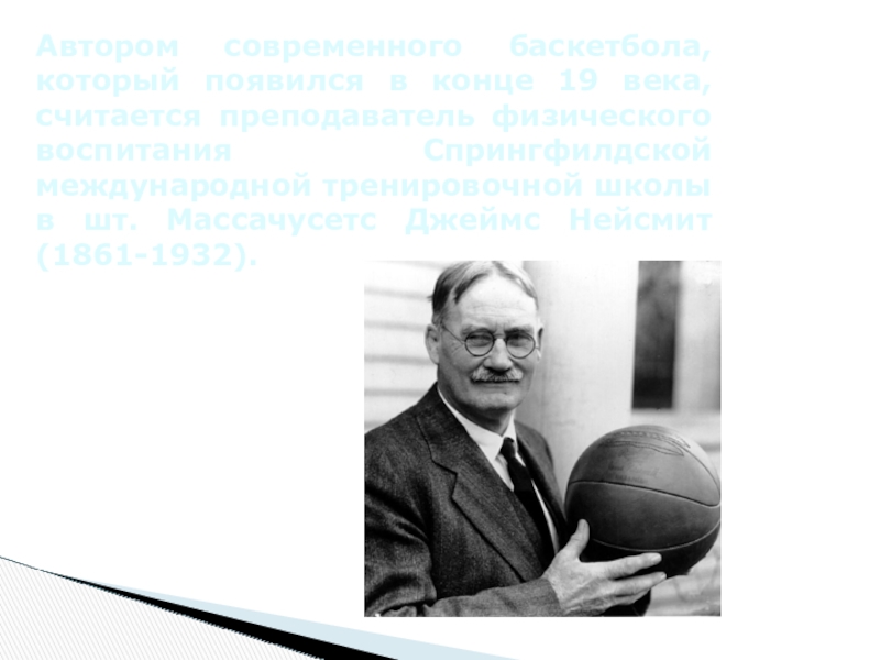 Слайд 4Автором современного баскетбола, который появился в конце 19 века, считается преподаватель