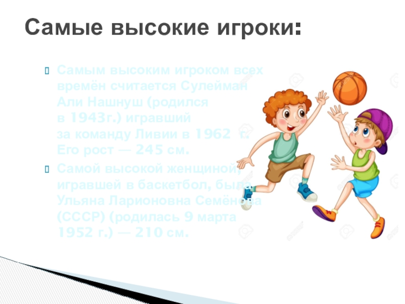 Самой высокой женщиной, игравшей в баскетбол, была Ульяна Ларионовна Семёнова (СССР) (родилась 9 марта 1952 г.) — 210 см.