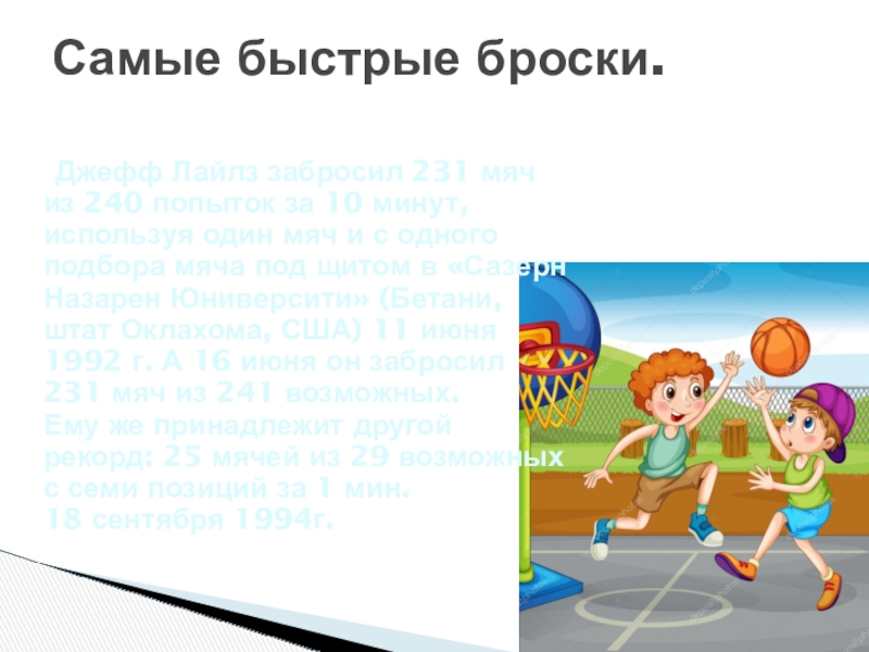 Джефф Лайлз забросил 231 мяч из 240 попыток за 10 минут, используя