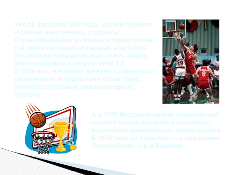 А в 1935 Международный олимпийский комитет вынес решение о признании баскетбола олимпийским видом спорта. В 1936 году он появляется в программе Олимпийских игр в Берлине