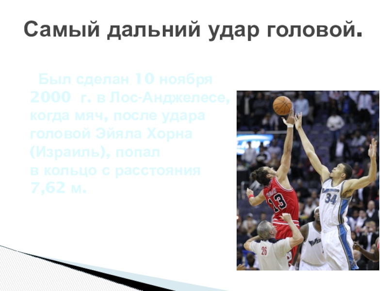 когда мяч, после удара головой Эйяла Хорна (Израиль), попал в кольцо с расстояния 7,62 м.