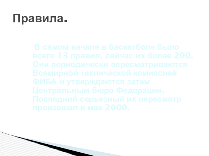 В самом начале в баскетболе было всего 13 правил, сейчас их более 200.
