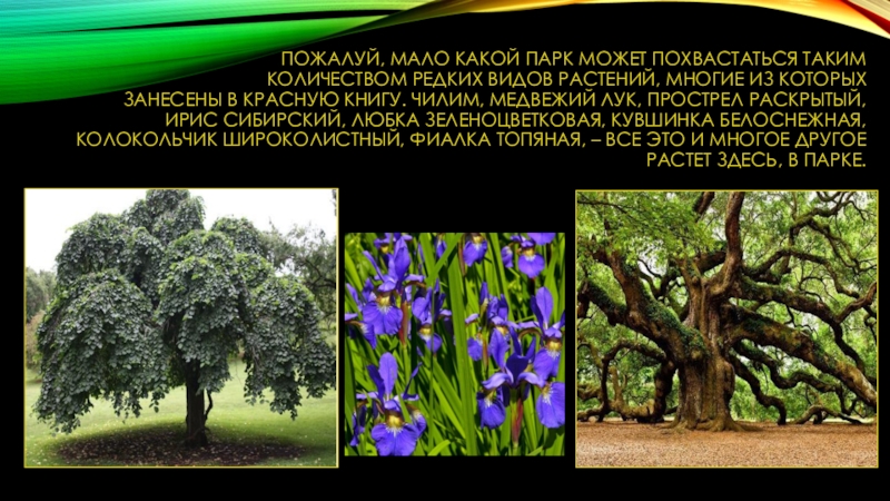 ирис сибирский, любка зеленоцветковая, кувшинка белоснежная, колокольчик широколистный, фиалка топяная, – все это и многое другое растет здесь, в парке.