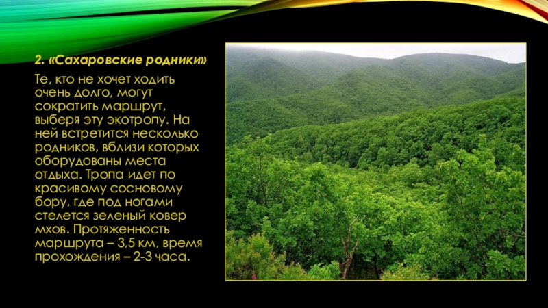 густые заросли леса, поднимается вверх и вновь сбегает вниз. Усталые путники смогут напиться прохладной воды из родника и отдохнуть в беседке на Пышкином лугу. Протяженность маршрута – 3,4 км, время прохождения – 2-3 часа.