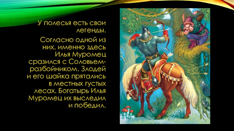 Илья Муромец сразился с Соловьем-разбойником. Злодей и его шайка прятались в местных густых лесах. Богатырь Илья Муромец их выследил и победил.