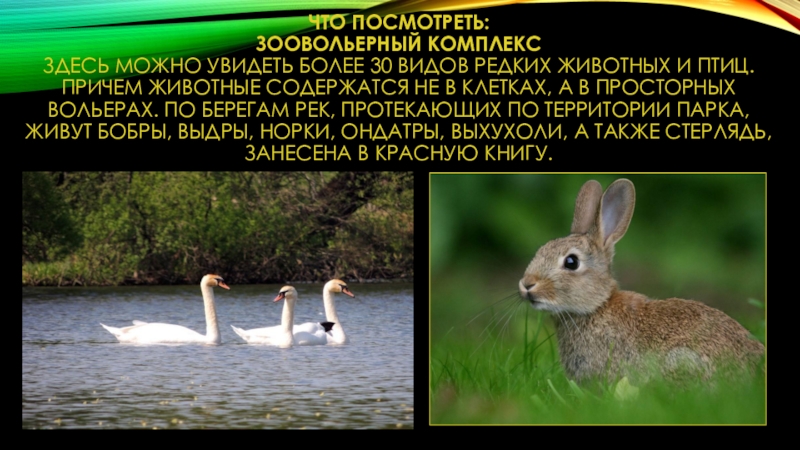 птиц. Причем животные содержатся не в клетках, а в просторных вольерах. По берегам рек, протекающих по территории парка, живут бобры, выдры, норки, ондатры, выхухоли, а также стерлядь, занесена в Красную книгу.