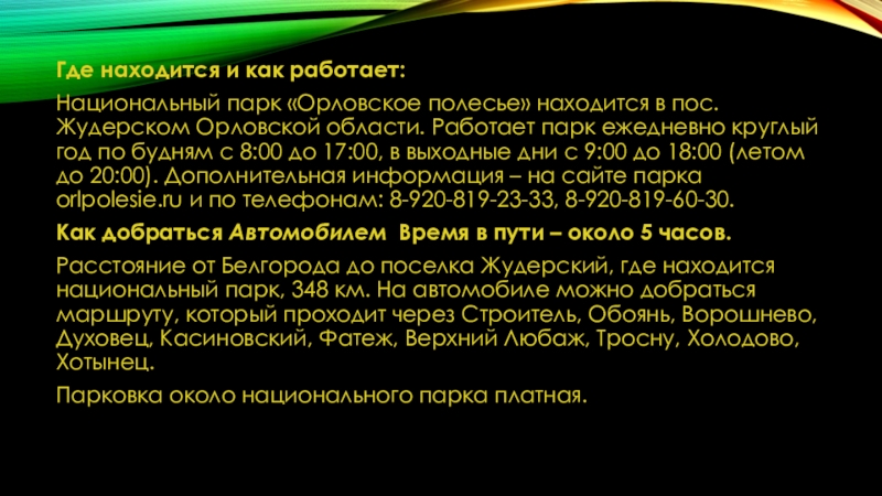 Жудерском Орловской области. Работает парк ежедневно круглый год по будням с 8:00 до 17:00, в выходные дни с 9:00 до 18:00 (летом до 20:00). Дополнительная информация – на сайте парка orlpolesie.ru и по телефонам: 8-920-819-23-33, 8-920-819-60-30.