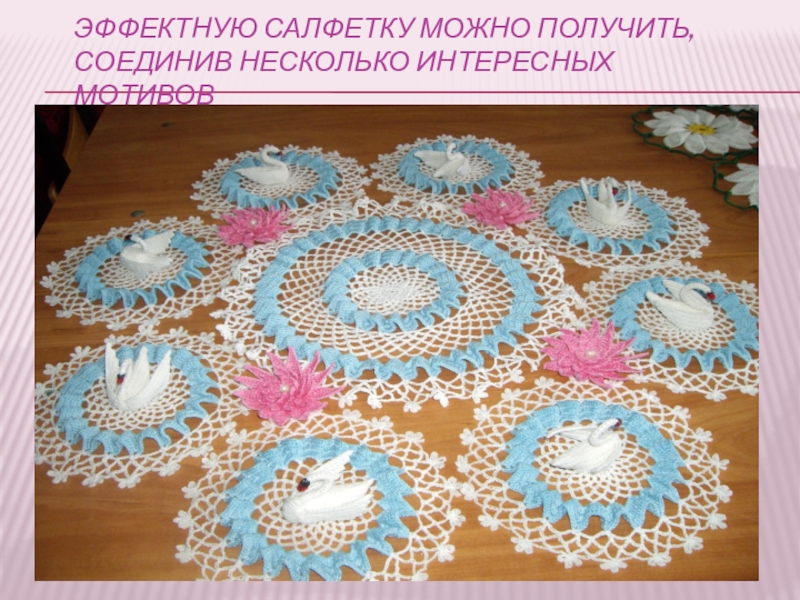 Слайд 10Эффектную салфетку можно получить, соединив несколько интересных мотивов